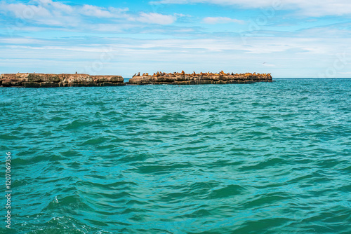 The rookery of Steller sea lions. A group of northern sea lions on a breakwater in the sea near Nevelsk City, Sakhalin Island