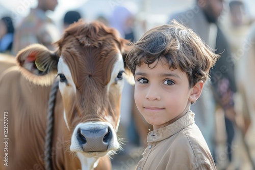 The sight of a cow at the animal fair on Eid al-Adha surprises a Muslim child, Generative AI.