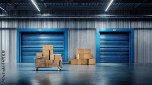 storage, box, warehouse, delivery, shelf, organisation, logistic, inventory, transport, moving, shopping, cart, facility, garage, business, blue, modern, industrial, tool, supply, cardboard box, work, space, clean, empty, tidiness, security, arrangement, background, indoor