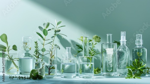 the synergy between natural organic botany and scientific glassware, showcasing alternative medicine herbs and natural beauty skin care products, in a research and development concept.