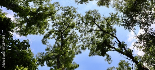 tree, sky, nature, forest, green, blue, tree, summer, leaf, leaf, branch, landscape, plant, tree branch, spring, wood, wood, birch, season, sun, light, sunlight, colours, colours, season, seasonal, tall, high, under, underneath, view, background, background, day, daytime, outside, outdoors