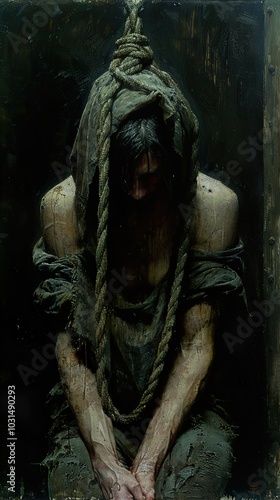 dramatic, morality, tragedy, hopelessness, visceral, dark, canvas, rope, shadow, intense, gloomy, powerful, melancholy, painting, texture, mysterious, engaging, intriguing, raw, despair, suffering, gloom, compelling, captivating, honest, life, detailed, fate, sorrowful, man, human, emotional