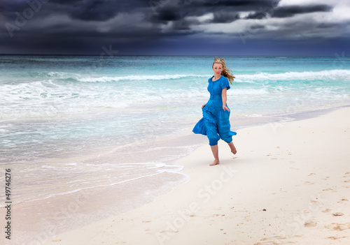 blond, beach, young, woman, water, ocean, storm, sea, girl, model, stormy, windy, freedom, 1, black, foam, cloud, wave, dark, grey, dress, step, long, cloudy, wind, blue, sunset, hair, sky, beautiful, turquoise, nature, splash, alone, landscape