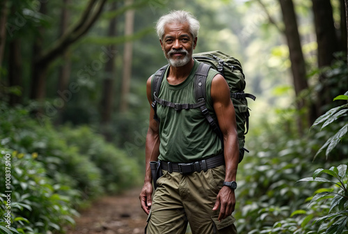 older, elderly, senior, black, african american, man, hiking, walking, wood, forest, backpack, grey, hair, strong, health, nature, person, outdoors, park, tree, people, summer, green, spring, grass, tree, walk, jean, day, leisure, hiker, lifestyle, outside, mature, trail, 1, active, man, activity, garden, smile, guy
