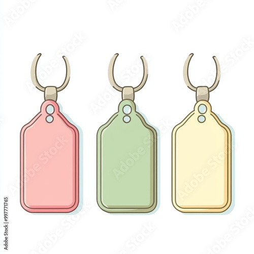 Three elegant dog tags in pastel hues hang against a clean white background, showcasing a flat design and modern aesthetic, ideal for pet identification