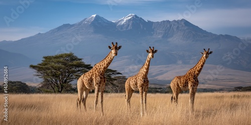 Three giraffes in a savannah landscape with mountains in the background. Possible use Travel, wildlife, nature