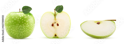 Three green apple one cut in half and slice with green leaf