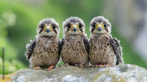 Three juvenile falcons perched on rock against natural green background