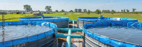 Three large blue tanks with a blue plastic cover. The tanks are filled with water. There is a pipe connecting the tanks