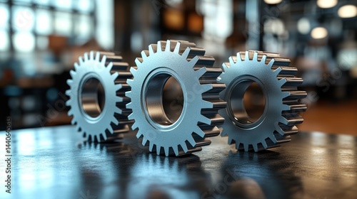 Three metal gears aligned on a reflective surface with a blurred background.