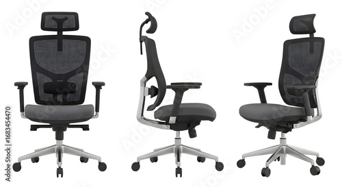 office chair, headrest, office furniture, chair, furniture, image, show, three, different, view, grey, mesh, office, with, seat, back, also, footed, wheel, include, front, view, side, transparent, background, art, design, digital, modern, creative, conceptual, professional, detailed