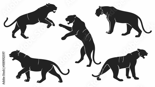 Tiger jump stand walk and other pose black silhouette flat vector illustration.