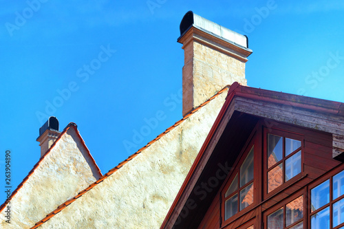 Tiled red gabled roofs with pipes
