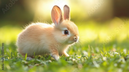 Tiny baby rabbit hopping in a lush green yard, pausing to bite the grass, capturing the adorable moments of this popular pet in action