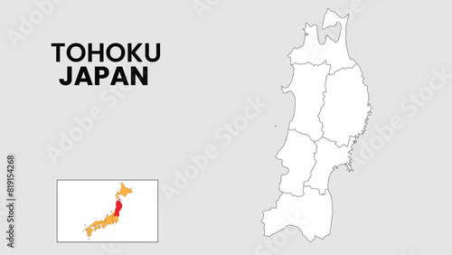 Tohoku Map. Outline state map of Tohoku. Political map of Tohoku with a black and white design.
