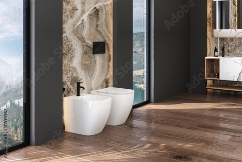 Toilet and bidet standing on parquet floor in beautiful modern bathroom with black and marble walls . Minimalist bathroom with modern furniture. 3d rendering