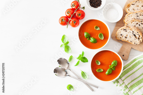up high, basil, bowl, bread, closeup, colourful, creamy, cookery, delicious, diet, dinner, dish, fine, food, fresh, garnish, epicure, green, health, healthy, herb, ingredient, leaf, liquid, lunch, meal, pepper, portion, red, soup, tasty, tomatoes, top, traditional, vegan, vegetable, vegetarian, white, copy space