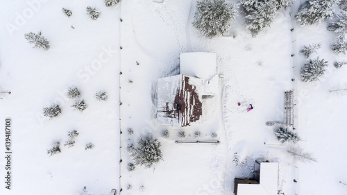 Top view at the timber house under snow in countryside. Courtyard with people playing in snowdrift.