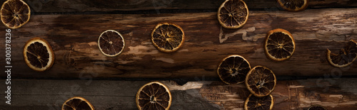 top view of dried citrus slices on wooden background, panoramic shot