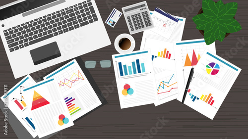 Top view of office workplace, office supplies, notebook. Charts, documents
