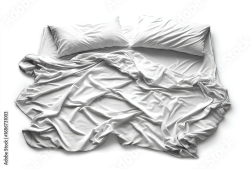 Top-down shot white crumpled bed sheets and pillows create abstract patterns, casting shadows on a white background. Crisp, clean, and inviting