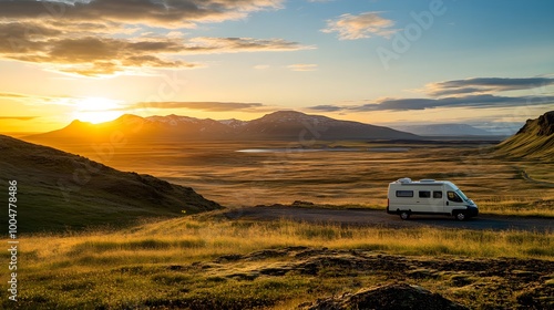 Tourists in rental car campervan by view of mountains in beautiful nature landscape.