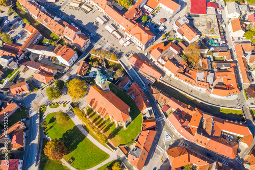 Town of Samobor in Croatia, cathedral tower bell from drone, overhead view
