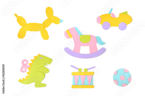 Toys paper cut on white background - isolated (handmade paper cut, not illustration)