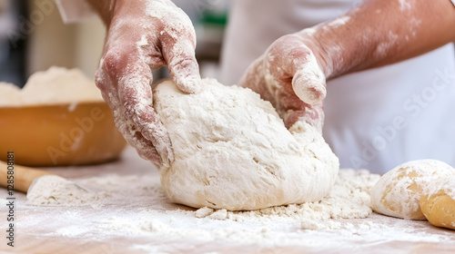 Traditional Baker Kneading Dough by Hand for Homemade Bread on Floured Surface : Generative AI
