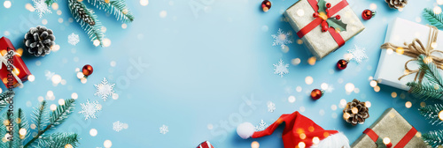 Traditional Christmas greeting cards and festive gifts arranged on a light blue background with seasonal decorations