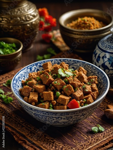 Traditional Indian food served in elegant heritage crockery, showcasing rich cultural flavors and intricate designs. A beautiful blend of Indian culinary art and vintage craftsmanship.