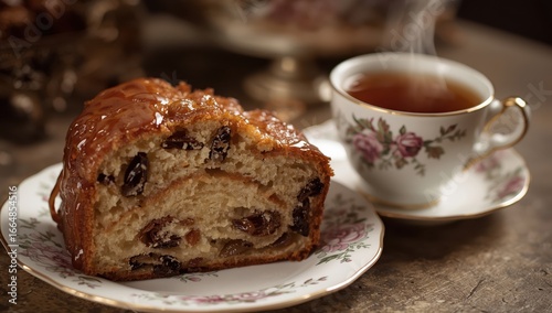 cake, traditional, slice, sticky, sugar, glaze, dried, fruit, sweet, bread, vintage, patterned, plate, floral, motif, steaming, cup, english, breakfast, tea, china, saucer, brown, rich, colours, layer, texture, warm, soft, sharpened, comforting, delicate, setup, dessert, pastry, baked, treat, inviting, cosy, presentation