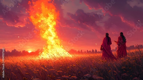 traditional, balefire, people, colourful, clothing, dancing, celebrate, surrounded, winter, crop, like, sugarcane, vector, style