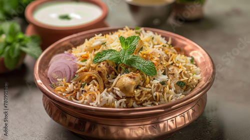 pakistani, food, rice, dish, traditional, cookery, copper, bowl, served, aromatic, spicey, chicken, garnished, mint, leaf, onion, side, yogurt, authentic, meal, photo, delicious, dinner, cultural, south, asian, flavorful, epicure, homemade, popular, presentation, culinary, culture, herb