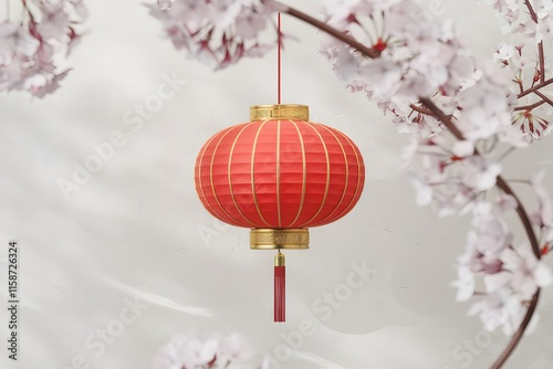 Traditional Red Chinese Lantern with Cherry Blossom Branches, Celebratory Festive Scene.