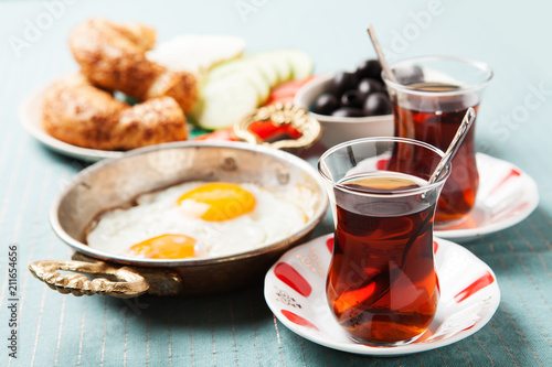 Traditional Turkish breakfast with fried eggs and tea
