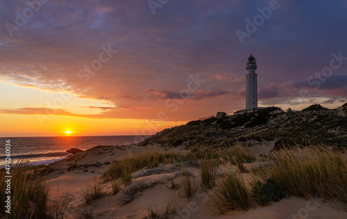 Trafalgar Lighthouse panoramic sunset view at Caños de Meca, Cádiz province, Andalusia, Spain