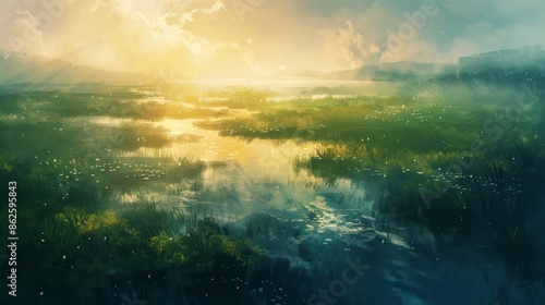 artistic, illustration, landscape, high, angle, view, meadow, muted, tone, abstract, shape, reflections, gold, hours, lighting, serene, tranquil, peaceful, nature, beauty, scene, aerial, shot, dreamy, picturesque, creative, expression, calming, art, photo, composition, soft, light, reflective, surface