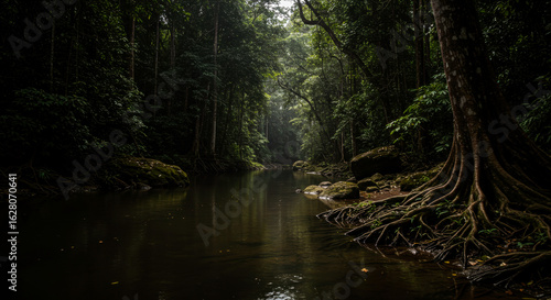 Tranquil Forest River Under Leafy Canopy – Serene Nature Scene