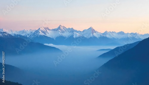 Tranquil mountain landscape at sunrise or sunset with fog, snow, and serene atmosphere amidst majestic peaks.