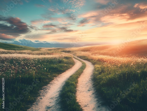 Tranquil Path Through Open Fields at Sunset with Clouds, Hills, and Vibrant Colors in a Serene Natural Landscape