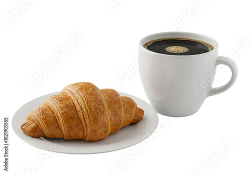 transparent ceramic coffee cup with dark black coffee and golden-brown croissant on a white plate against a stark studio background, concept of minimalist breakfast comfort