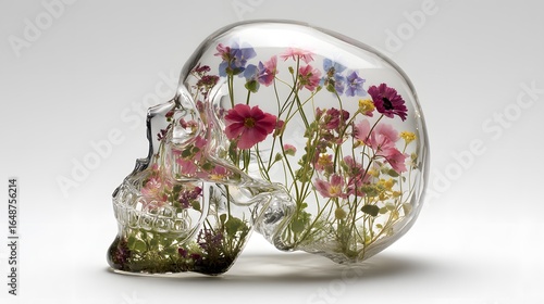 Transparent skull filled with preserved flowers.