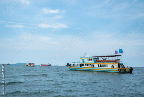 travel ship in the ocean landscape with beautiful blue sky in Thailand,Boat for tourism traveler on beautiful sea concept