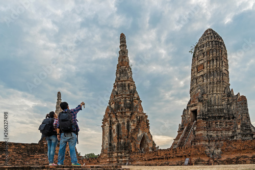 Traveler man and women with backpack walking in asia temple Ayuttaya, tourists travel in Thailand. Travel Concept