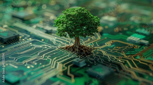 Tree growing on circuit digital board, Digital and Technology Convergence