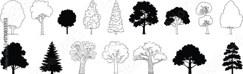 Tree silhouette and outline illustration set, forest nature design, eco environment concept, park landscape elements, seasonal foliage collection, natural background