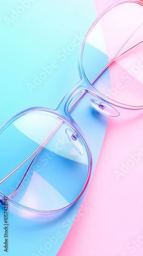 Trendy transparent eyeglasses on pastel pink and blue background. Modern fashion accessory with clear frames showcasing minimalist style and contemporary design.