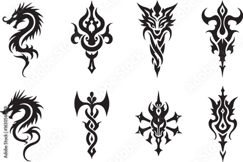 dragon, tribal, tattoo, vertical, design, mythical, fantasy, fierce, creature, fire, snake, asian, symbol, tribal art, bold, inked, mystical, power, ancient, warrior, gothic, flames, sharp, spiritual, guardian, guardian, decorative, fantasy art, black-and-white, line art, beast, monster, emblem, body art