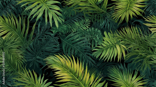 tropical, palm leaf, pattern, background, foliage, design, jungle, dense, green, nature, botanical, vector, illustration, wallpaper, textile, summer, plant, leaf, seamless, dark, exotic, monstera, natural, paradise, vibrant, greenery